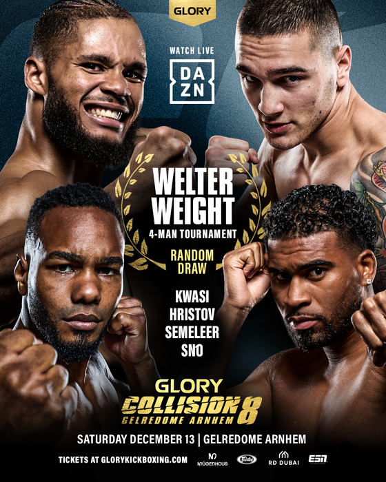 ウェルター級では、世界チャンピオンのチコ・クワジ(オランダ)が、元GLORY世界ウェルター級王者エンディ・セメリア(キュラソー/オランダ)、元挑戦者のテオドール・フリストフ(ブルガリア)、そして新たに追加されたドン・スノ(スリナム)と対戦する。