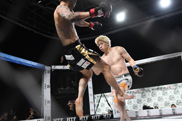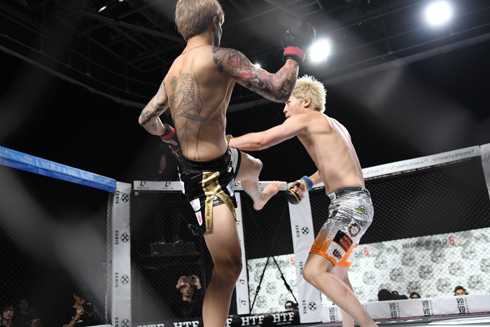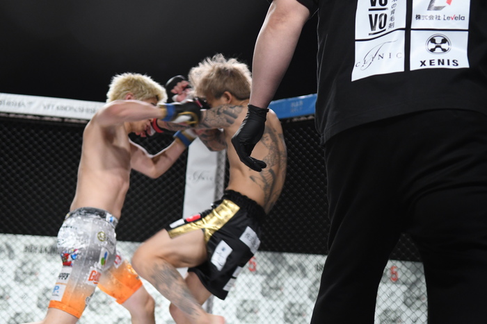 竹見が圧をかけてのワンツーで前へ出ていくが、龍志が残り10秒で二段蹴りの左ハイでダウンを奪う。挽回を狙って前へ出た竹見だが手が出ず試合終了。