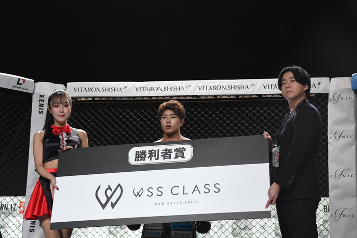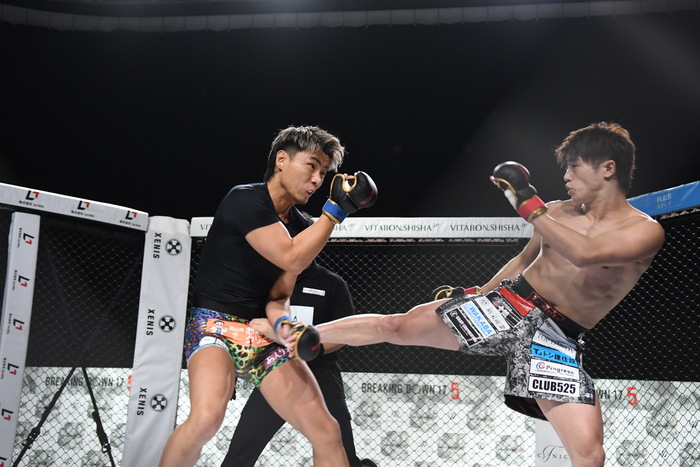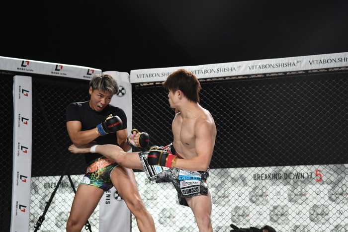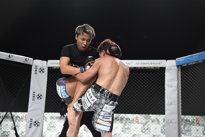 野田蒼の推薦・金剛と西島が対戦。西島は前蹴り、左ミドル。金剛はガードを固めて前へ出ると組んでヒザ。金剛の右ストレートに左フックで対抗する西島。