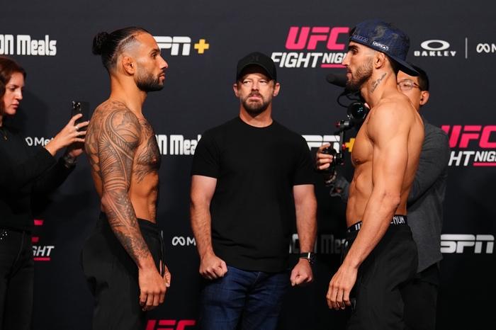 1R、サウスポー構えののデル・ヴァイエが左ロー。その打ち終わりにオーソのダルガリアンがダブルレッグへ。ケージまでドライブも差し上げるデル・ヴァイエががぶりからバック。