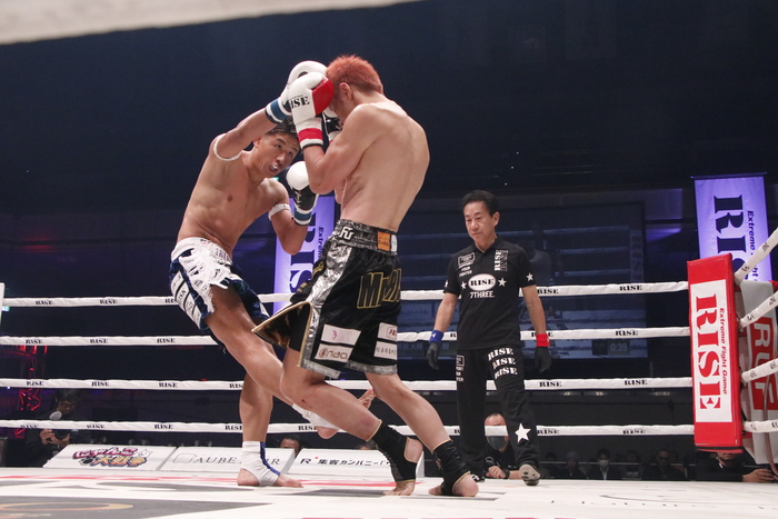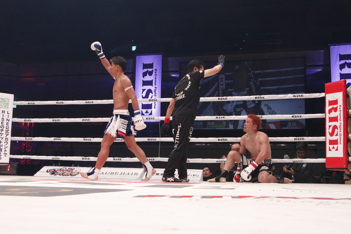 2R、飛びヒザを連発する戸井田に裕樹は左奥足ローと左インローを連打していく。裕樹のペースになり始めたところで、戸井田が飛びヒザを命中させてダウンを奪う。
