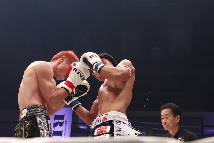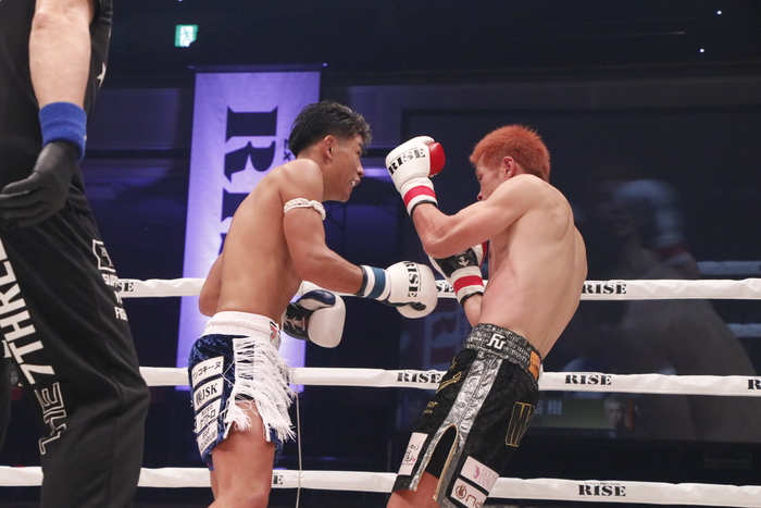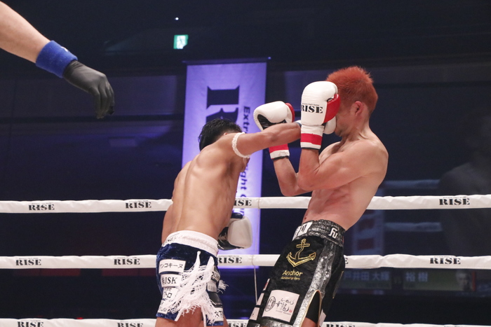 1R、ブロックを固めて前に出る裕樹は左右ロー、戸井田は右カーフ、左三日月、右アッパー、左右フックとボディと多彩な技を繰り出し、裕樹は戦いづらそう。右カーフではフラつく場面も。