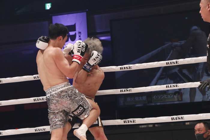 2R、回り込む麻火だがソンヒョンの圧を受け続ける。ソンヒョンが右ストレート、左フックをヒットさせ、麻火をロープ際やコーナーへ追い込む場面が増える。麻火は横蹴り、前蹴り、後ろ廻し蹴りで対抗も、このラウンドは押された。