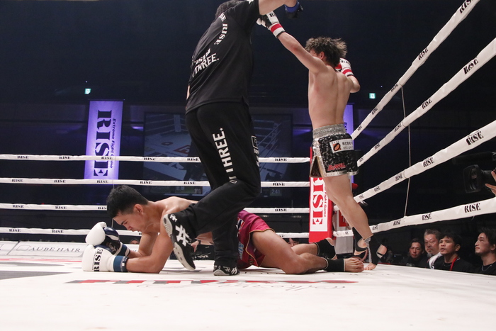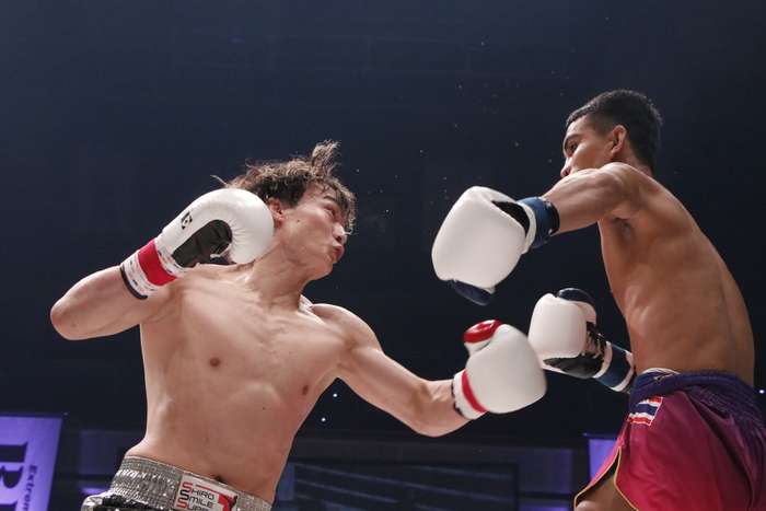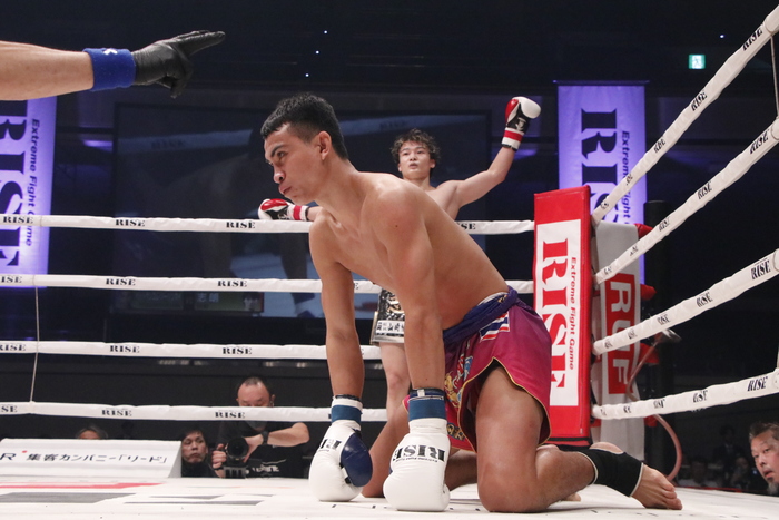 2Rが始まってすぐ、志朗が右ストレートから右の連打を叩き込むと、ペットサンコムはたまらずダウン。立ち上がるもフラフラしており、レフェリーがストップした。