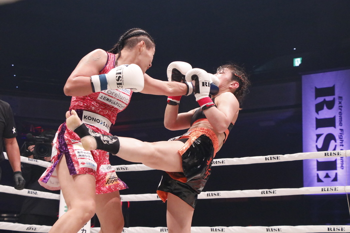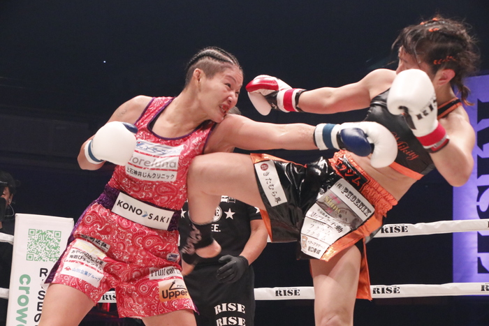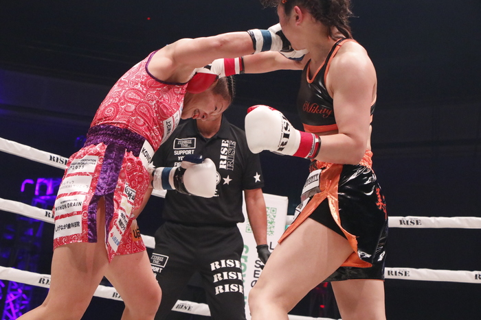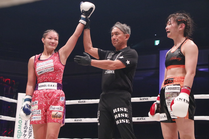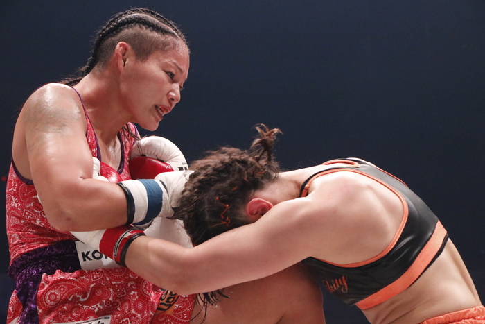 吉田はマイクを持つと「12年ぶりのキックボクシングのリングに上がって緊張があって内容的には50点かなってところだったんですけれど、勝ててよかったのと快く迎えてくれた皆さんに感謝します。ボクシングもキックもやるからにはトップを目指したいです。まだまだ実力足りないけれど、テッサと戦えるように頑張るので」と、テッサ・デ・コムとの対戦を目標に掲げた。