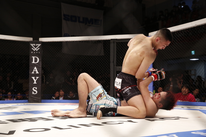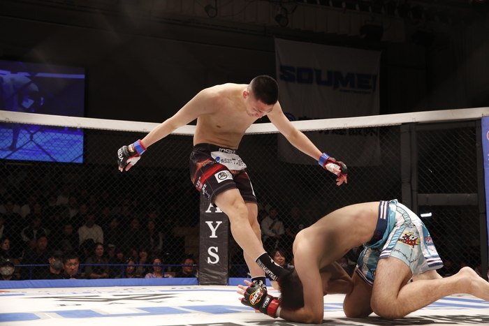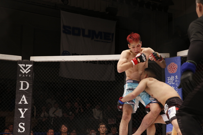 ジャブ突き前に出る大原にまたもダブルレッグテイクダウンの神田はマウント。抜けて立つ大原にサッカーキックを打ってゴング。