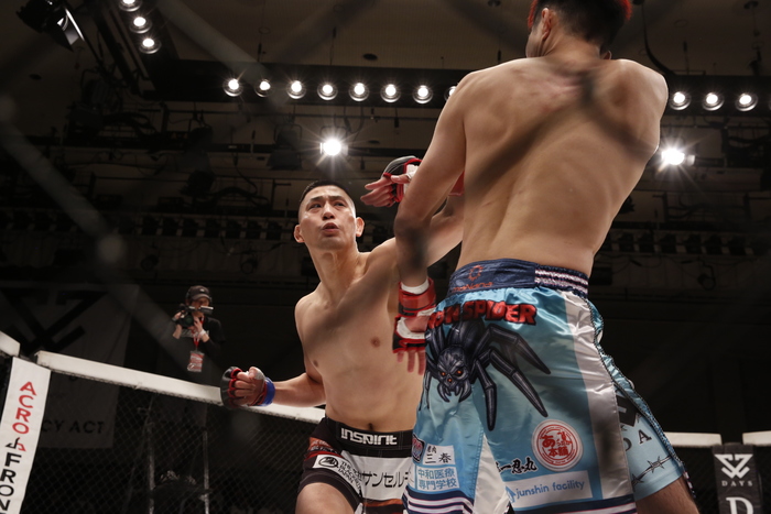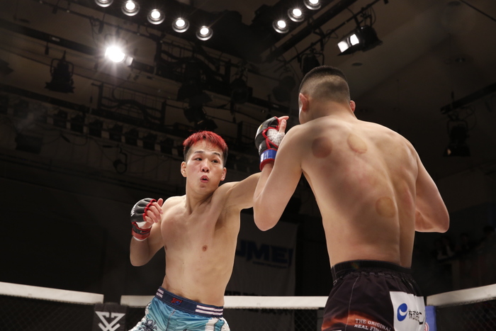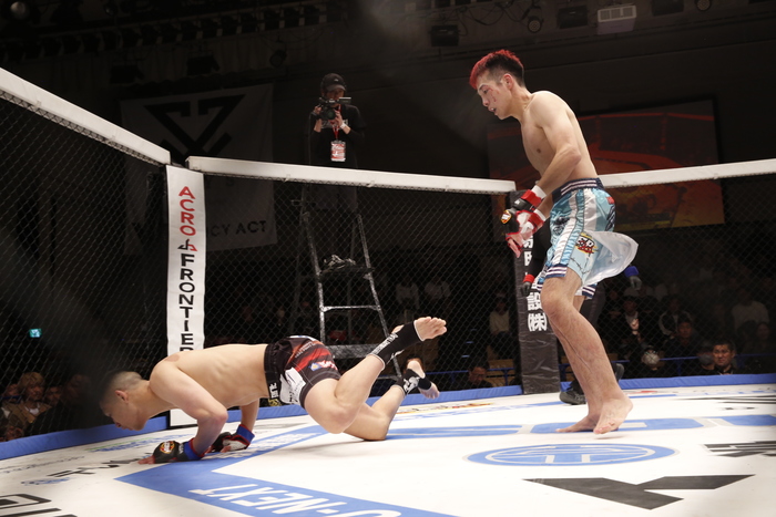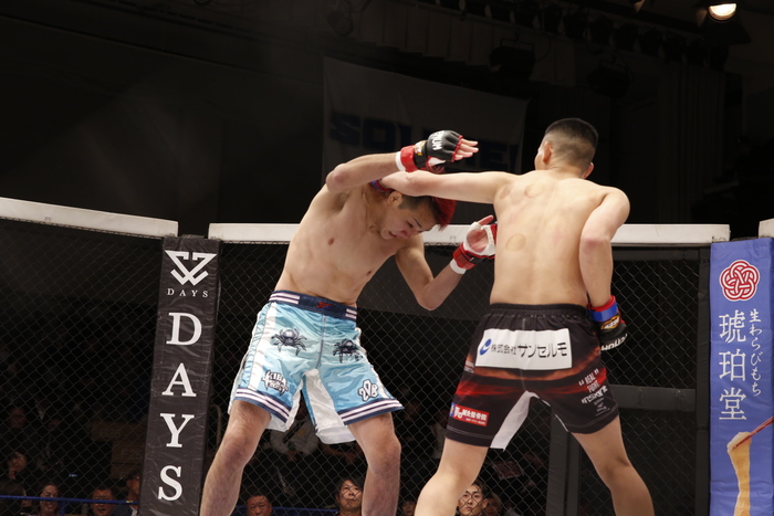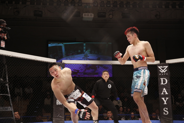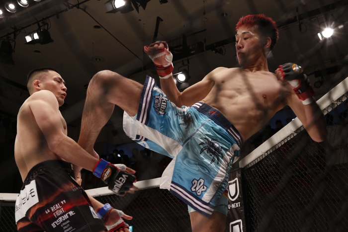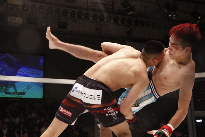 左右ラッシュに、神田は頭を下げながらもケージづたいに回るが、追う大原が左右をまとめると神田はついにダウン! 2R残り1秒でレフェリーが間に入った。