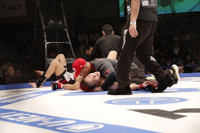 ワンツー、右ストレートの大原に神田はダブルレッグテイクダウン。そのままサイド、マウントに背中を見せて立つ大原のバックにつく神田。それを見越して前に落とす大原だが、神田は落ちながら三角十字狙い。腕を外した大原に、神田はデラヒーバからバック狙いカーフスライサーを仕掛ける。