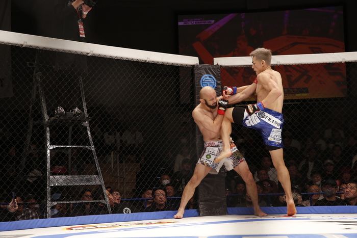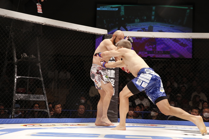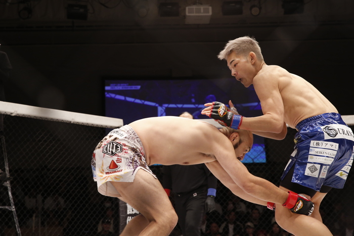 1R、オーソから圧力をかける倉本に、サウスポー構えの大木は右前手のフックと左インロー。倉本は右を突いて、右ハイもガード上に。シングルレッグの大木を切ってバックエルボーを突く倉本。
