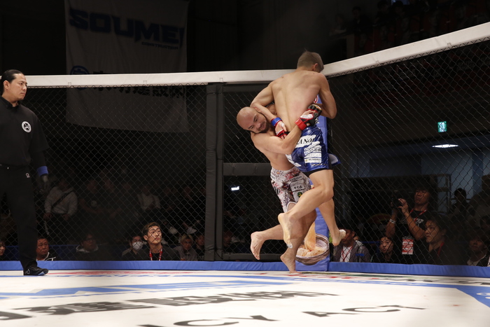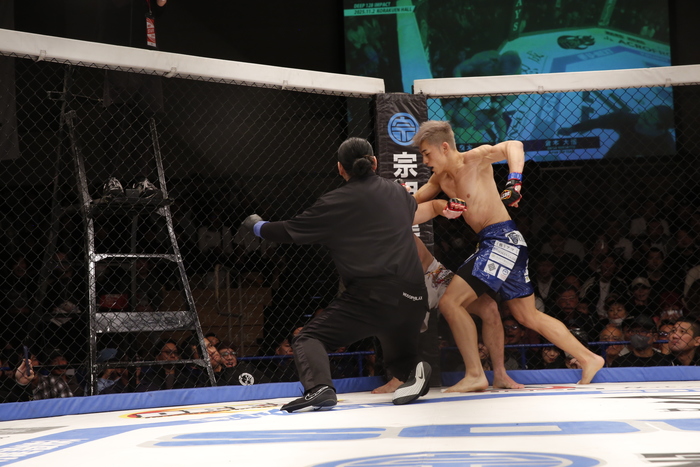 2R、じりじりと圧力をかけう倉本がワンツーから左ヒザ、さらに大木の前手をはたいてワンツー。ケージに詰めて左ヒザを効かせると、打ち下しの右ストレート! 崩れた大木に左右をまとめ、レフェリーが間に入った。