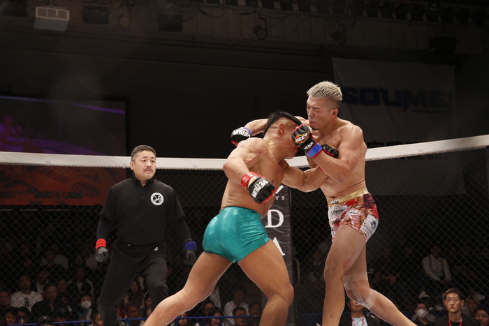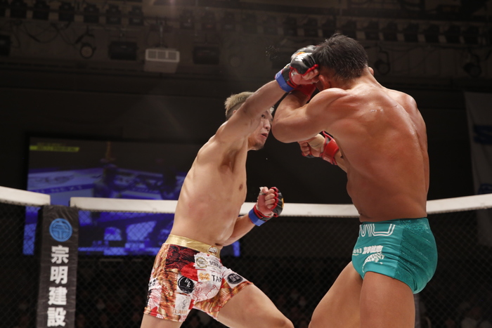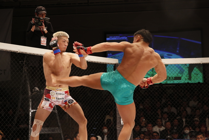 中央は山田に。左ミドルを突く北岡にレベルチェンジを見せながら右ストレート。その入りに北岡も左フックから右に繋いで迎撃。左ミドルハイでけん制の北岡。山田は右スーパーマンパンチで飛び込みを見せる。