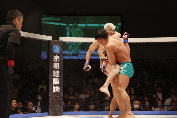 2R、中央を取る北岡。左を突いて前に出るが、体を入れ替える山田。両脇差しの山田に、北岡は細かいパンチ。ブレークから大きな右を張り手のように振ってダブルレッグテイクダウンの北岡に、逆ギロチンを仕掛ける山田。頭を抜いた北岡に、スクランブルの山田。そこを北岡は首を狙う。北岡のギロチンに首を抜いた山田がサイド狙うが立ち上がり突き放す北岡。