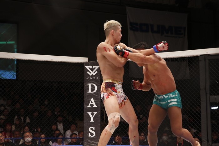 3R、山田の右がヒット、北岡の左をかわして右ボディ。さらに前進にケージ背にジャンピングガードを見せる北岡。引き込むも北岡が首を抱えると山田はすぐに頭を上げる。ブレーク。左フックで飛び込む北岡に山田はバック狙い。しかし落とした北岡に腕十字狙いもかつぎパスの北岡。山田の立ち上がりにがぶり。首を抜く山田。鼻血の北岡は左ミドル。山田は右ストレート。北岡の右に左フック! 力を使ったか、北岡は打撃に軸がブレるように。