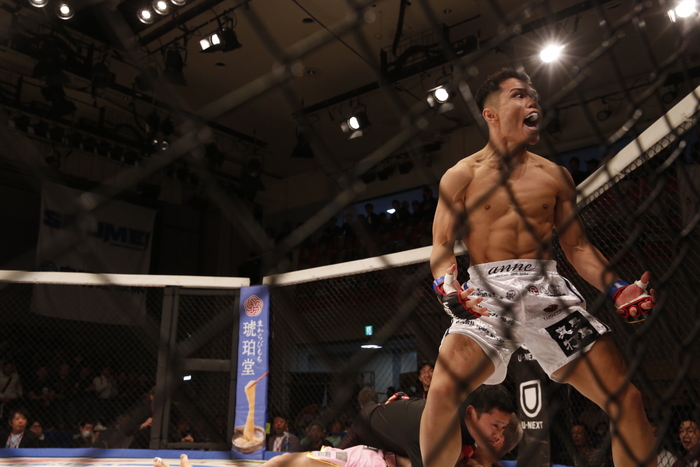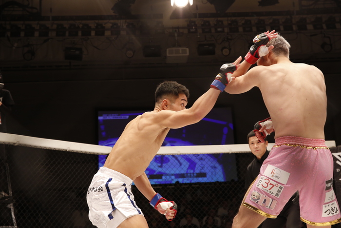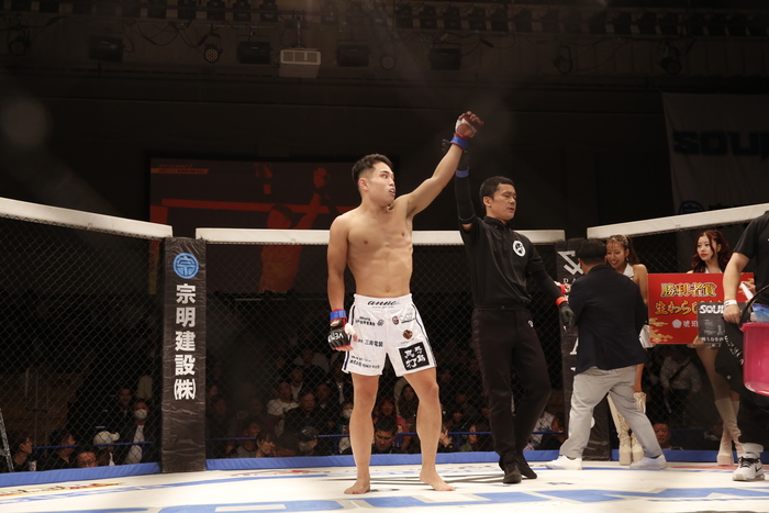 1R、じりじりと圧力をかける直樹。しかし三井は、ワンツーで前進し、飛び込んでの左フック! 直樹が後方に倒れ、パウンドにレフェリーが間に入った。三井が元RISE王者に衝撃のKO勝利。