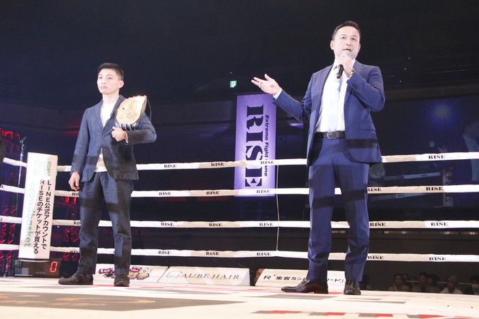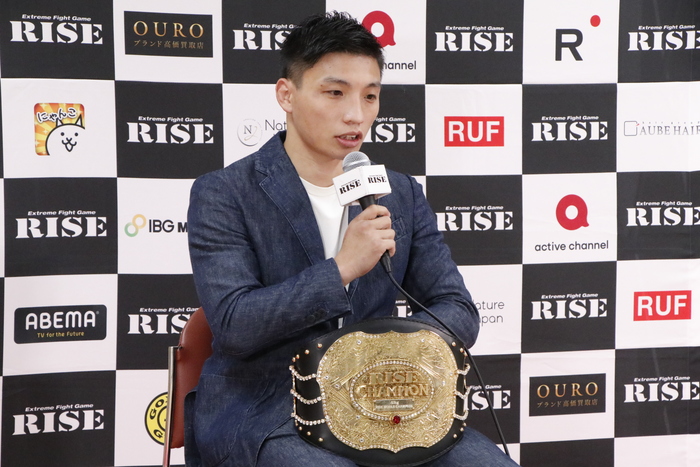 大﨑は「今回ムエタイルールでの試合になるんですけれど、もちろん負ける気はないですし、RISEを背負ってタイで必ず勝って日本にベルトを持って帰ってきます。チームと自分自身のことを信じて必ず勝ってくるので、皆さんぜひ応援をよろしくお願いします。ベルトをRISEのリングに持ってくるので皆さん楽しみにしていてください」と、ラジャダムナンのベルトを持って帰ってくると約束した。