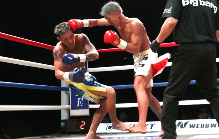 1R、城戸は左ローキックを連発。サウスポー構えの大輝は、追いかけてパンチを狙うもかわされてしまう。大輝は右フックも、城戸の左ストレートでダウンを喫した。立ち上がった大輝は、果敢にパンチを振っていった。