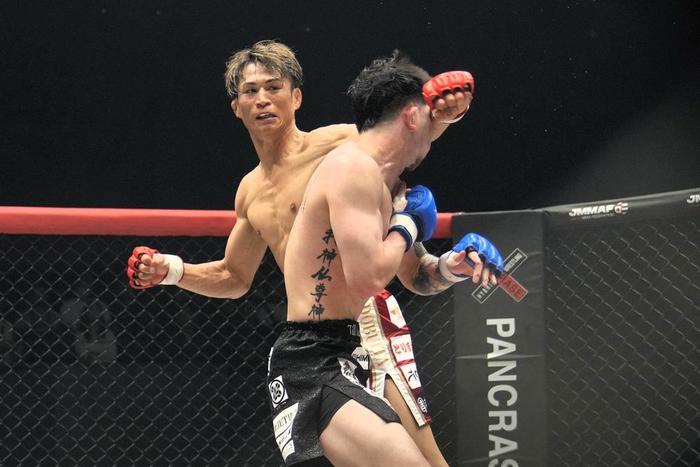 そして“日本人ライト級ストライカー最強決定戦”と呼ばれた天弥との試合では、「フィジカルがあるから、打撃で厳しい場面でも組んで組み立てられる。中盤から相手の動きが落ちてきたのが分かり、フィニッシュ付近も相手の回転の速いパンチを急所をずらして受けて、覚悟を決めるしかないと思って、自分から額で受けてやろうって。最後は無意識でヒザを突いてました。もう練習でも出したことない」というヒザ蹴りでダウンを奪い、パウンドアウトした。
