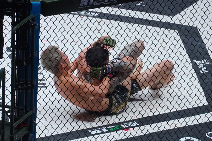 追う秋元も左右で前に。萩原は右ボディ! さらに左フックも、それをダッキングで潜った秋元はその動きのままシングルレッグテイクダウン。サイドを奪われた萩原の動きにバックに回る秋元は4の字ロックからおたつロック。リアネイキドチョークを狙うが右足がおたつロックでかかり右には回れない萩原。腕が回りかけるが、ハンドファイトで防ぐ萩原。
