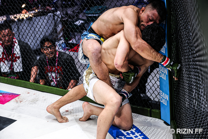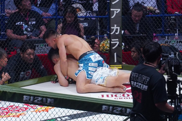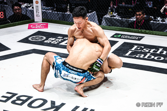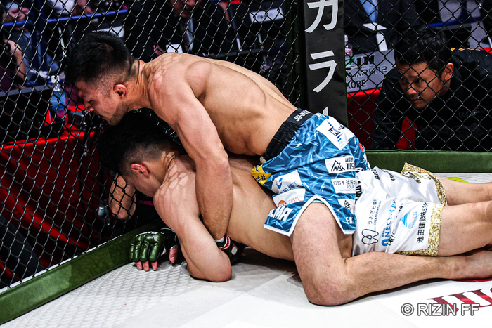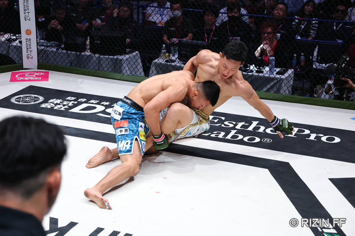 1R、サウスポー構えの摩嶋に、オーソの木村。グローブタッチ。中央を取る木村。右フック、左アッパーをもらいながらも摩嶋はダブルレッグ、切る木村にさらにダブルレッグを2度、3度目で尻を着かせると立つ木村をボディロックテイクダウン。再三立つ木村のバックに回り崩して、ついに右足をかける。ケージづたいに左手首を持つ摩嶋。