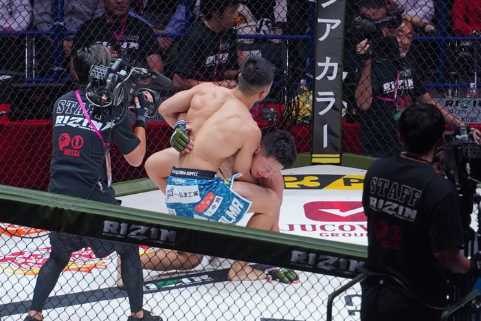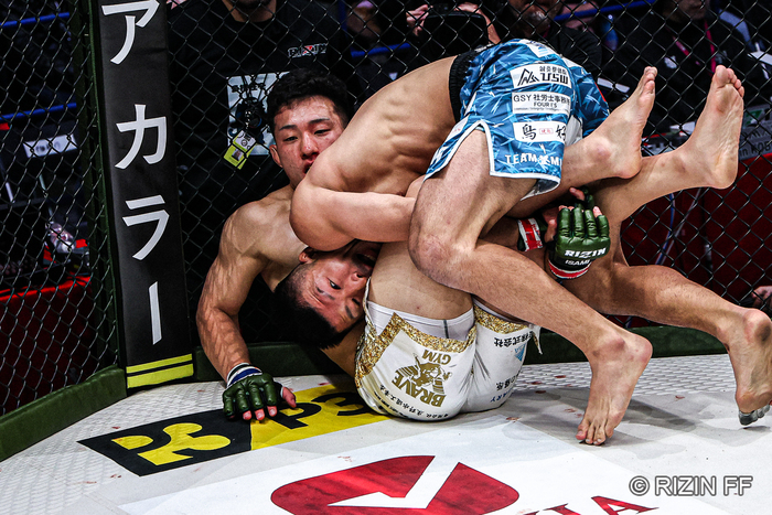 左足もかけて両足をフックすると前のめりになって木村の身体を伸ばそうとする。座ったまま崩れない木村に背後からパンチを入れて、フェイスロック、さらにリアネイキドチョークへ。入れさせない木村は片ヒザ立ちのまま凌ぐ。アタックを続けてテイクダウンして削った摩嶋。木村は2R勝負もスタミナを使ったのはどちらか。