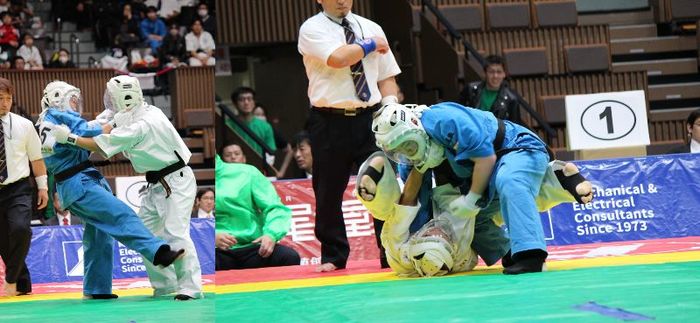 【写真】支え釣り込み足から内股への連絡→キメ突きで、快挙を達成した小野寺(青)