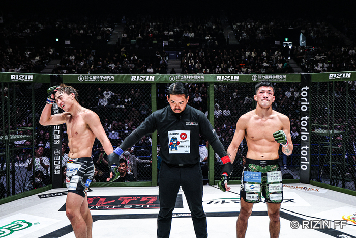 「たぶん1R目はタックルとか色々切って、僕はパウンド入れてて、まあ勝ってるぞっていう感じで。まあ2R目は最後のあんま覚えてないですけど、ちょっと極められかけてましたよね。腕十字かな。3R目は“行け! 行け!”っていう感じで。まあ自分は負けてるかというところはちょっと分からない状態で戦ってたんで。で、僕的にダメージ、パウンドの感触もあったので、僕はちょっと“勝ってるかな”と思って笑顔でいた感じですね」
