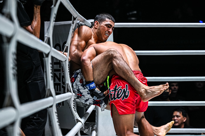 アリショフは背中から降りるとすぐにダブルレッグ。ガブったブーミナアンはヒザ蹴りとクリンチアッパーで離れる。
