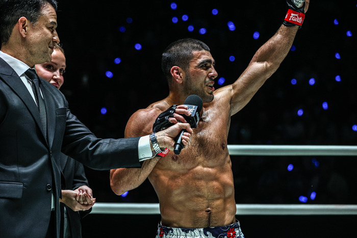 ブーミナアンの左フックをかわしたアリショフがダブルレッグでまたもテイクダウンし、サイドを奪う。立ち上がろうとしたブーミナアンをハーフガードからギロチンに捕らえたアリショフ。全力で絞めあげてタップを奪った。