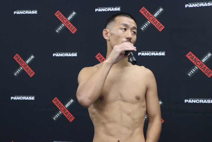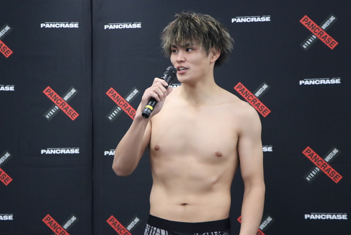 (会見で)急遽オファーをいただきありがとうございます。PANCRASE3戦目ですが、しっかりフィニッシュして、上位ランカーへの手土産に持って行こうと思っています。相手(合島)の印象は、ベテランなんで、うまくステップと圧力をかけてくるような印象。フィニッシュ力もある。僕もオフェンス面で言ったら結構強いと思ってるんで、自分も勝負勘に関しては自信を持っています。相性としては、僕の方が有利かなと思ってます。その理由としては、相手はベテランで年齢的な問題もあるし、僕の方がフレッシュなぶん回転も速いし、インパクトというか初撃の速さも自分の方が上だと思ってるので、僕の方が有利だと思ってます」