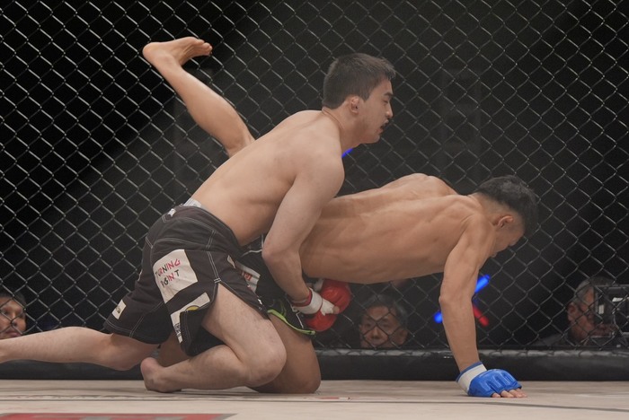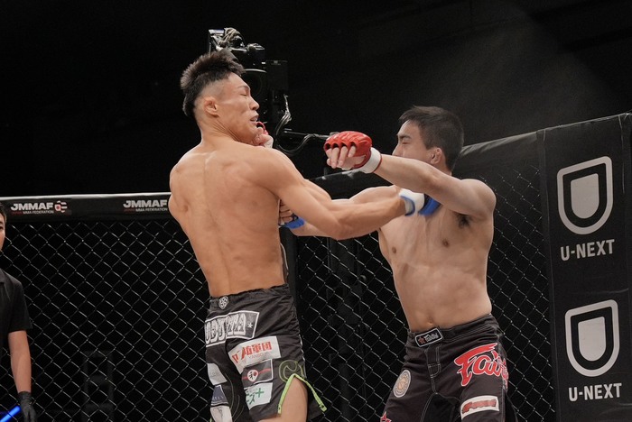 2R、前蹴りから右ストレートで前に出る清水。そこに右跳びヒザを狙う糸川はシングルレッグで押し込み。右小外蹴りでテイクダウン! 金網に上体を戻して座って立つ清水を再び崩した糸川。立つ清水は体を入れ替え、崩し。