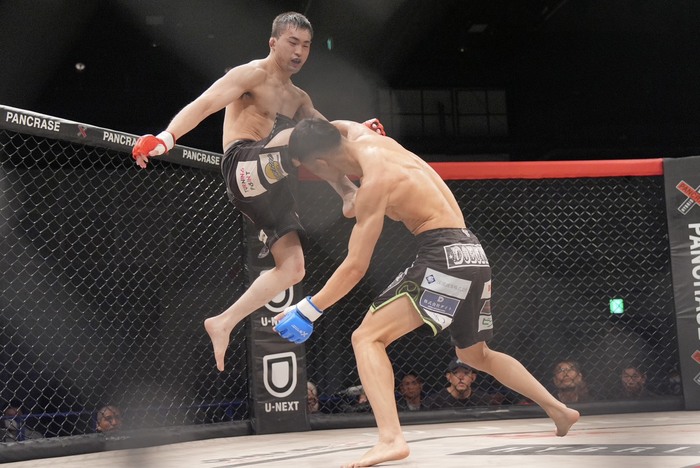 シングルレッグで引き出すが、ケージ背に戻る清水がヒザを突き、右を当てて前に。被弾した糸川は右を返して右ハイは空振り。清水は右アッパーからワンツースリーの連打でなぎ倒してダウンを奪い、TKO勝ち。