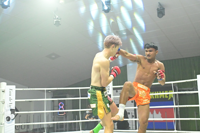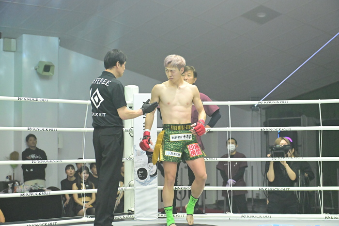 1R、サウスポーの古村は左フックから右カーフ、さらに左ストレート。古村は左ストレートからいきなりラッシュを仕掛けていくがミルは組み付く。ブレイク後、古村は一度距離をとるが、左カーフを蹴ったところでミルが右手を伸ばし、その指が古村の左目に入ってしまい試合中断。