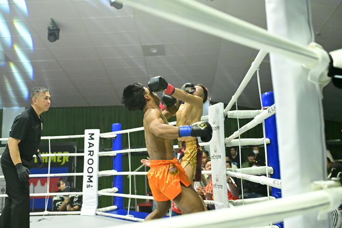 1R、パナットが右ハイで先制すると川野は右ローを蹴りながら前へ出る。パナットは右ミドルと右フックを同時に出す変則的な動きを見せ、左右フック。右カーフを集中的に蹴る川野はワンツーにつなげ、その逆パターンも。右カーフにパナットの上体が揺らぎ、転倒もする。思い切り右フックを振ってワンツーを打ち込むパナットに、川野も右ストレートを打ち返す。ワンツーでどんどん前に出るパナットに右カーフ、左インカーフを下がりながら蹴る川野。