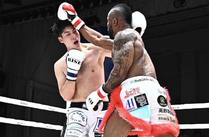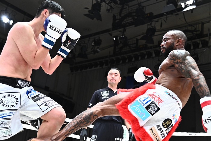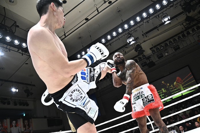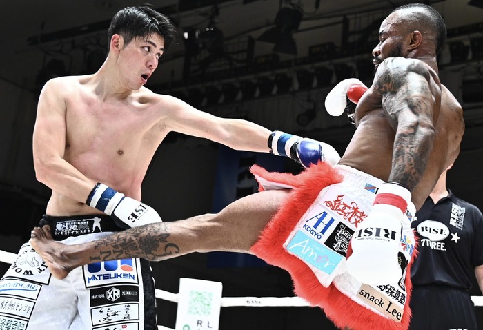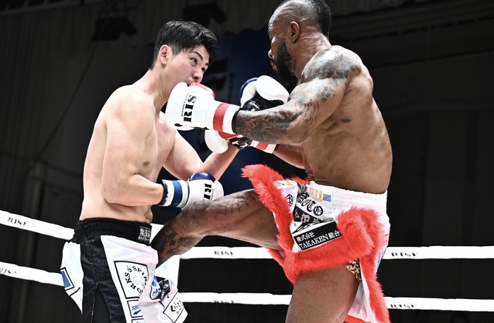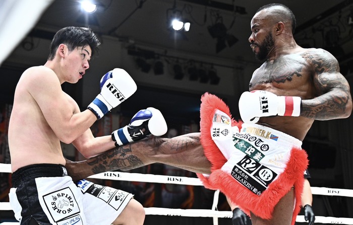 鞠谷の右インローにカルンダもスイッチする。右フックをヒットさせるカルンダに鞠谷は左右ミドル。前蹴りも見せる。カルンダの左フックをもらった鞠谷だが、右ハイを返す。