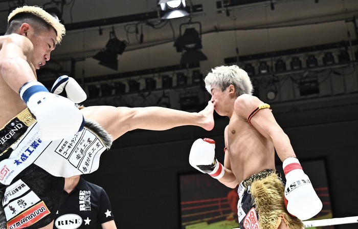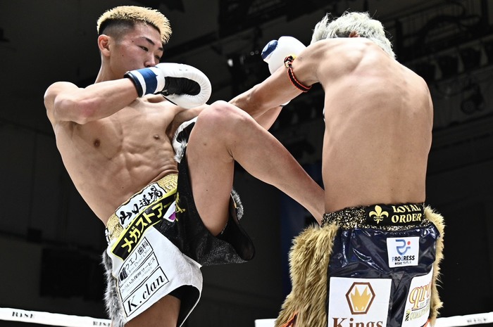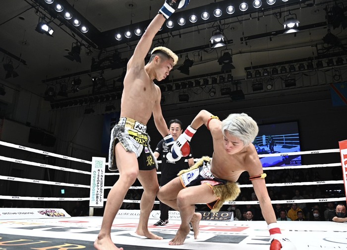 1R、右カーフの蹴り合いから、山田は飛び込んでの左ボディとヒザを見せる。その飛び込みからヒザを蹴ろうとした武蔵を右フックでダウンさせた山田。近距離でスピードのある連打を繰り出す山田に武蔵も打ち合う。