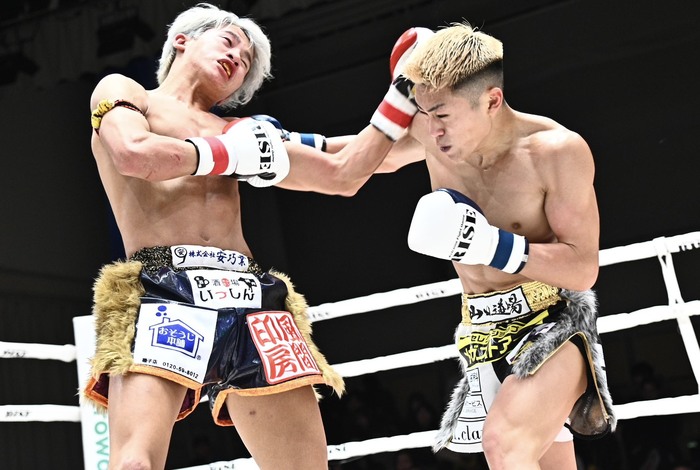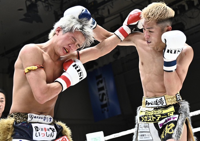 2R、山田は左ボディを打ち、身体の押し合いでも負けずにロープへ押し込む。近距離ではヒザ。武蔵のパンチよりも回転が速く、2発、3発と打つ山田。武蔵の左フックにも左ボディを合わせる山田。武蔵はヒザから右ストレートを打つが空振り。近距離でパンチを回転させる山田に武蔵が左フック。