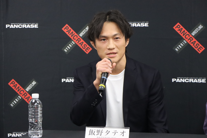 飯野選手の印象は、寝技を軸に、けっこう打撃とか圧をかけてきて、タックルの部分とかもありますし、とても強い選手だと思いますので、見積もりは高めに設定して今日までやって来ています。やっぱり僕が目標にして来たのは、この階級のPANCRASEのベルトだったので、常にその気持ちは変わらず、ずっと戻ってきてここで戦いたいなと思っていました。NEXUSでベルトを巻いて、ストロー級では防衛はしてないんですけど、フライ級で試合間隔を開けずに戦って来たので、そういう姿をまたPANCRASEで見せられればいいなって思ってます。(団体対抗戦のようでもあるが?)そうですね、やはりNEXUSにチャンピオンとして一戦も負けるわけにはいかないので、それが基本だと思うので、しっかり経験したことを出したいなと思ってます。