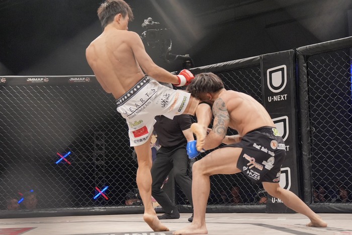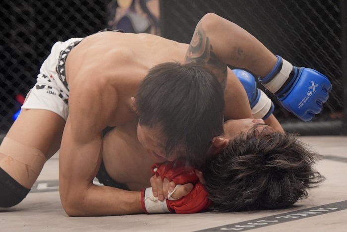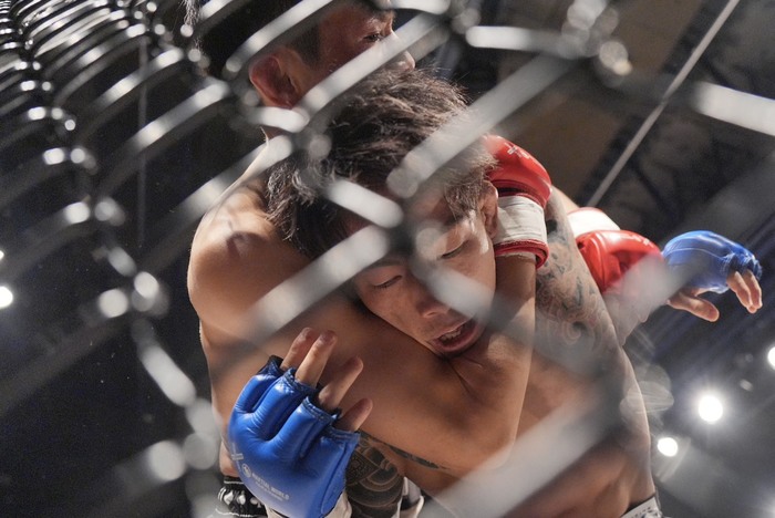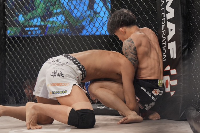 1R、ともにオーソドックス構え。先にダブルレッグの宮澤を切る飯野。左ロー。宮澤は右を振ってダブルレッグテイクダウン、飯野の立ち際を追いダブルレッグもそこにニンジャチョークを合わせる飯野。首を抜いた宮澤。バッククリンチから正対する飯野。