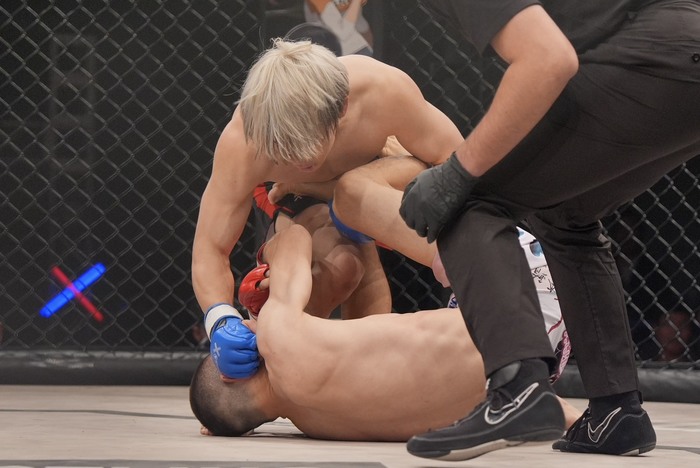 スタンド。ワンツーで前に出る野田。遠間からダブルレッグテイクダウンの佐々木。野田の立ち際に右を当てると、右足を掴んだまま回して崩して足を掴んだまま鉄槌連打! レフェリーが間に入った。