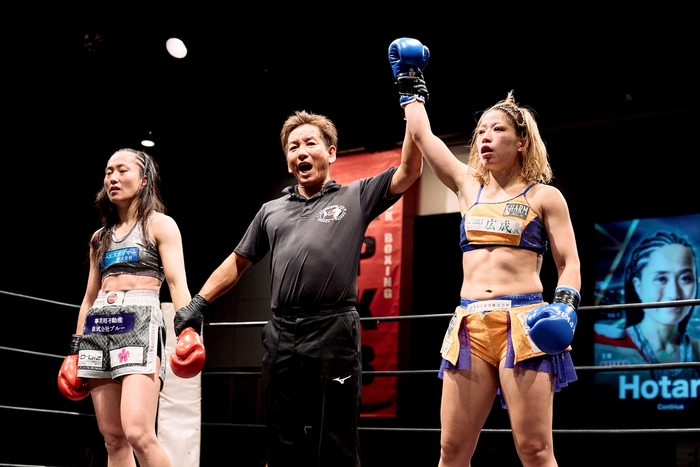 前回鈴木に負けているHotaruは、初回から気合いと決意を感じるファイトを見せる。鈴木もそれに応えるかのように1Rから激しい殴り合いに。譲らない展開は3Rまで続き、鈴木が判定勝利。初めてのベルト獲得となった。