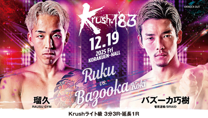 KNOCK OUTの主力選手であるバズーカ巧樹が2018年11月以来、約7年ぶりのKrush参戦が決定。ライト級トップファイターの一人である瑠久と対戦する。