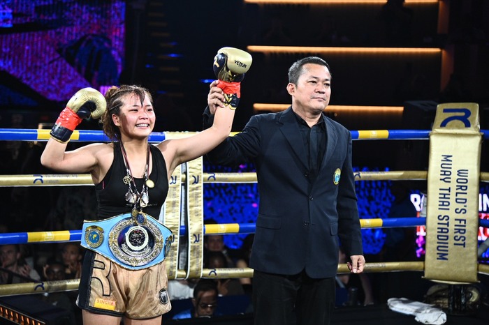 逆転の判定3-0で勝利し、ラジャダムナンスタジアムで日本人女子初、WMOでも日本人女子初となるベルトを巻いたユウリは号泣し、父の細貝泰一会長と喜びを分かち合った。