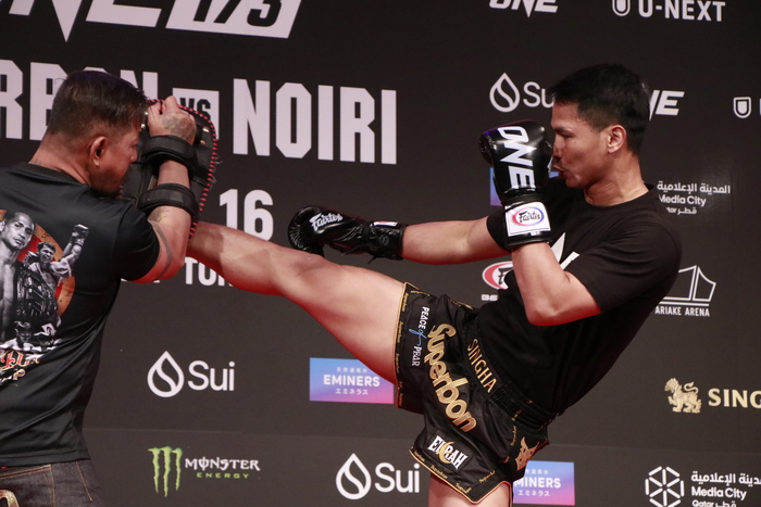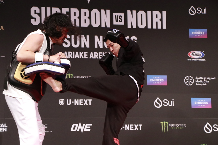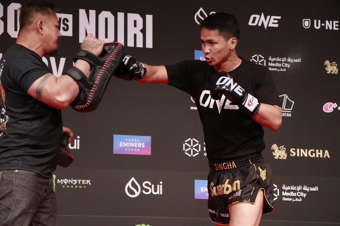 第17試合(メインイベント)のONEフェザー級(※70.3kg)キックボクシング世界王座統一戦3分5Rで対戦する、正規王者スーパーボン(タイ)と暫定王者・野杁正明(team VASILEUS)はそれぞれミット打ちを披露。野杁は左ミドルキックを軽く連打するにとどまったが、スーパーボンはワンツーに左右ミドル、ローキック、得意の右ハイキックと一通りの技を繰り出した。