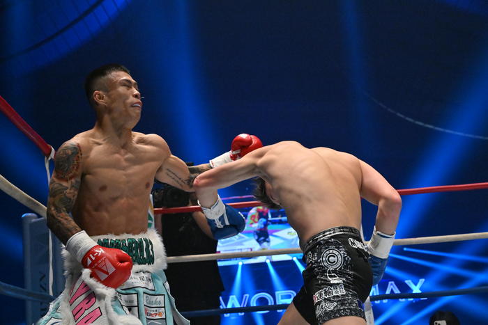 1R、永坂は右ミドル、松本は左インロー。永坂は左右にスイッチしての左右フック連打とミドルを見せる。蹴りを多く出す永坂に松本は左三日月蹴り、左ボディ。ノーガードになって余裕を見せていた永坂だったが、右フックで前に出ようとした瞬間、ラウンド終了間際に松本のワンツーが真正面からヒットしダウンを奪う。