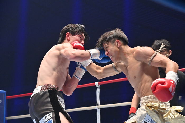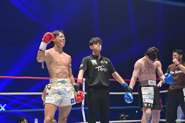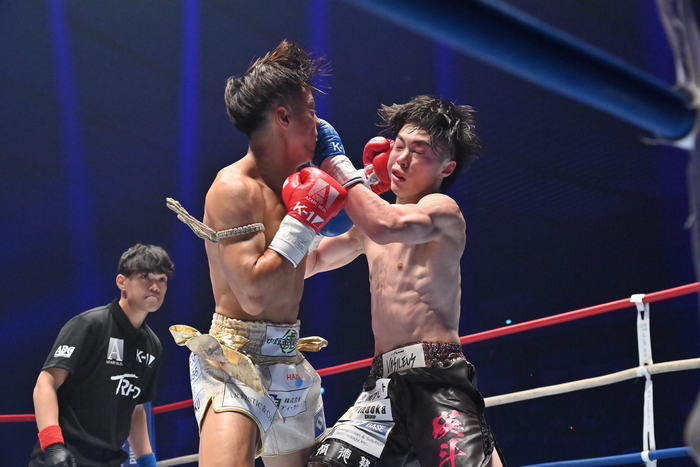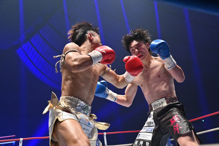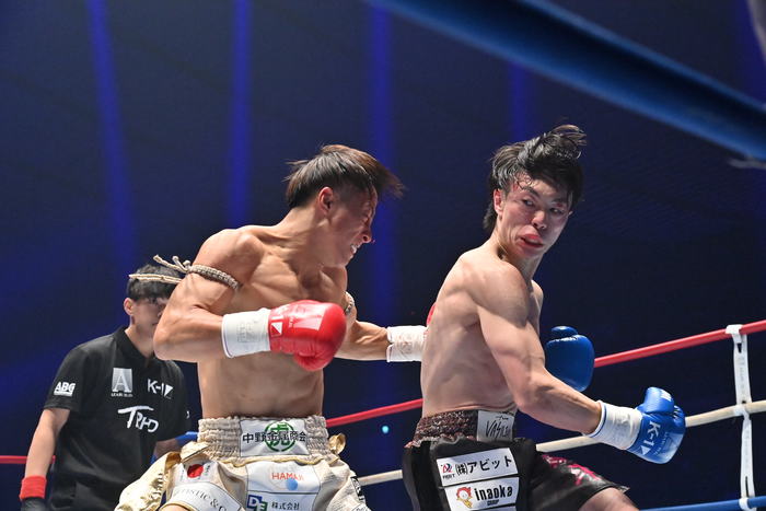 1R、サウスポーの黒川へ石井は右インローと左ロー、前後にステップを踏みながらじりじりと距離を詰めていく。黒川の左ストレートはかわすが、黒川は左ミドルで追撃。黒川が右カーフから左ストレートを狙う。石井が距離を詰めて左右フックを打つと黒川も左ストレートを返す。石井は右ミドル。ラウンド終了直前、打ち合いに行った石井が左右フックを当てた。