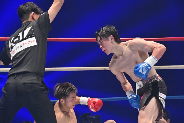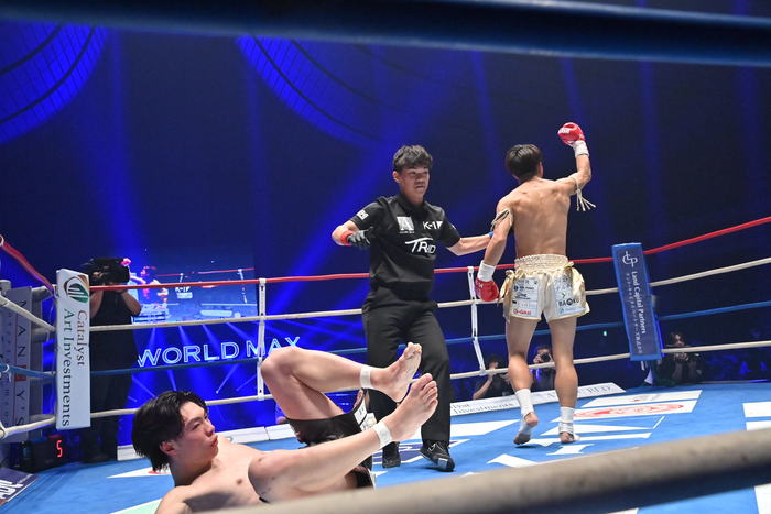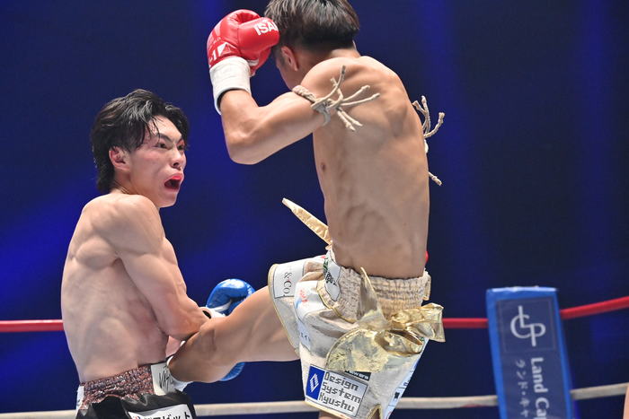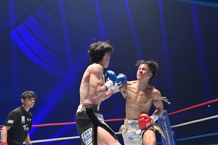 3R、黒川が打ち合いに行き、左ストレートを当てるが石井も打ち返す。どっと沸く場内。石井も左フックで反撃し、黒川が飛びヒザに来たところで石井は左手で相手を押し、距離をとっての右フックでダウンを追加。