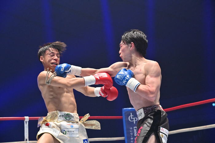 立ち上がった石井へ左ヒザを突き上げ、右アッパー、左ストレート、ワンツー。石井もワンツーで打ち合いに行き、ショートの左フックでアゴを打ち抜きダウンを奪い返した。