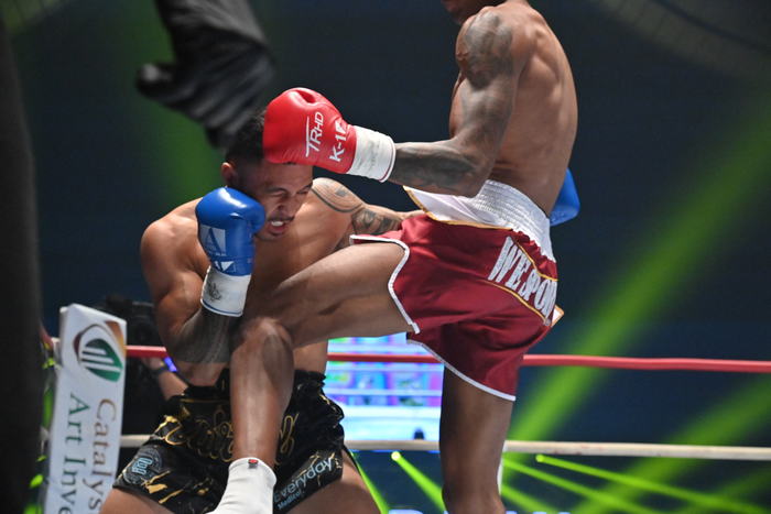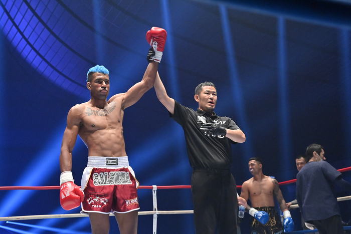 1R開始と同時にサルシチャがヒザ蹴りから左右フックのラッシュを仕掛け、すぐにダウンを奪う。
