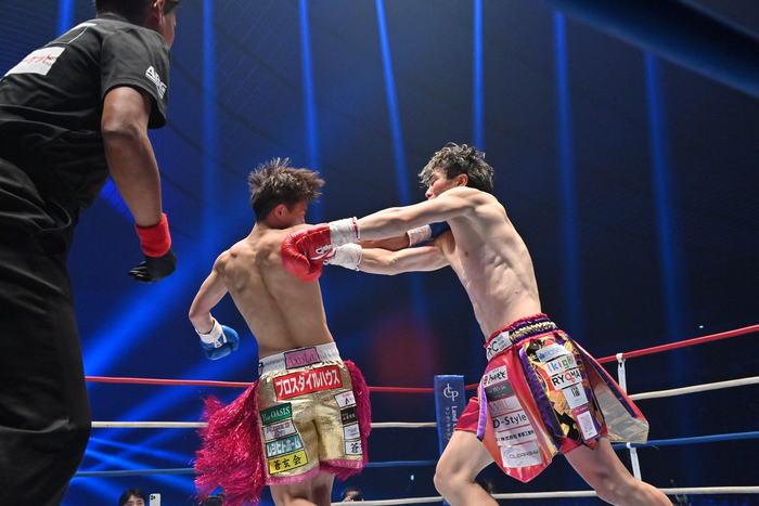 1R、サウスポーの横山は右へ回り込んでいく。レオナは右ストレート、左へ回り込んでの左アッパー。横山は左インロー、右ロー、レオナのジャブにローを合わせて左ストレートを返す。レオナの右ボディにも左を合わせに行く。レオナが右インロー、横山も右ローを返す。横山が3連打を出すとレオナも前へ出て打ち合いに行き、両者が打ち合って会場がどっと沸く。