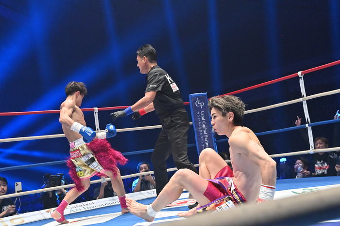 2R、飛びヒザを放つレオナ。右ストレートで前へ出ていくと横山も下がりながら左ストレートを打つ。左ロー、左ミドルを蹴りながら下がる横山。レオナは左手を下げたデトロイトスタイルからジャブと前蹴り。左インローを連打したレオナに、横山が前へ出ての右フックからの左フック。これががヒットし、レオナが仰向けにダウンした。横山は下がって距離を取り、左を蹴る。レオナは連打で逆襲に出る。